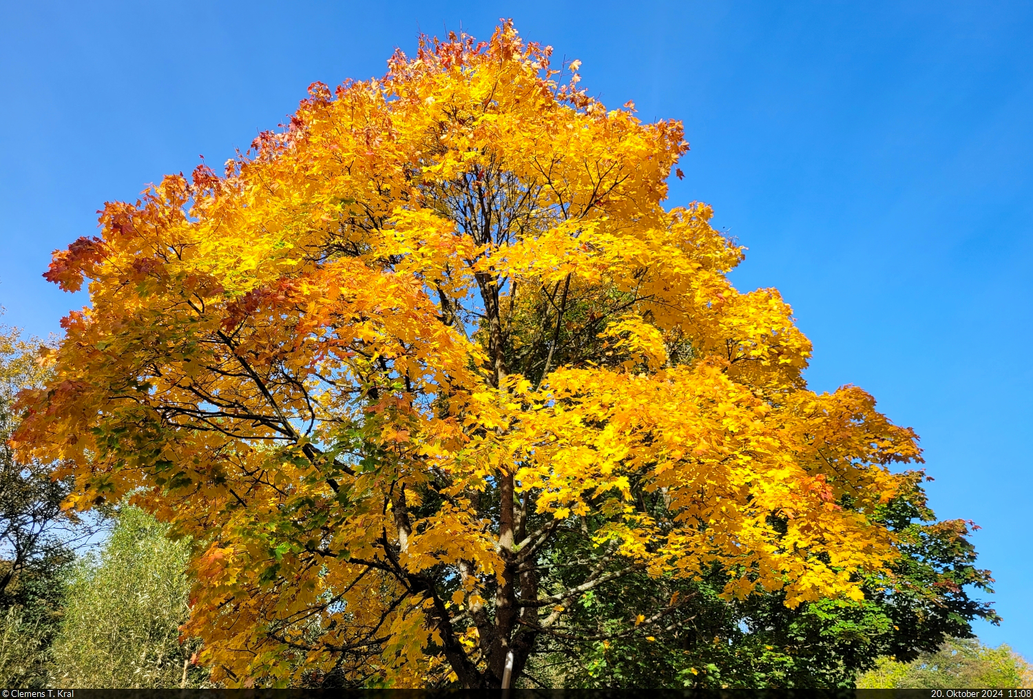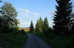 Herbstlich buntes Laub im Mischwald an der Hahnenkleer Waldstraße; Blick am 22. Oktober 2024 kurz vor Sonnenuntergang Richtung Osten bis zu den gegenüber liegenden Bergen jenseits des Odertals...