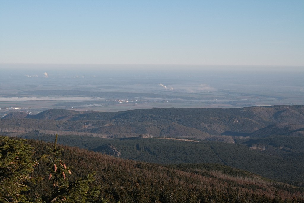 Blick am frühen Morgen des 15.10.2011 vom Gipfelrundweg des Brocken Richtung Norden. Am Harznordrand ist links der nördliche Teil von Bad Harzburg zu erkennen und rechts oberhalb davon Vienenburg. Nördlich davon steigt Rauch auf aus mehreren Industrieanlagen zwischen Hornburg und Salzgitter. In einigen Tälern liegt Nebel.
