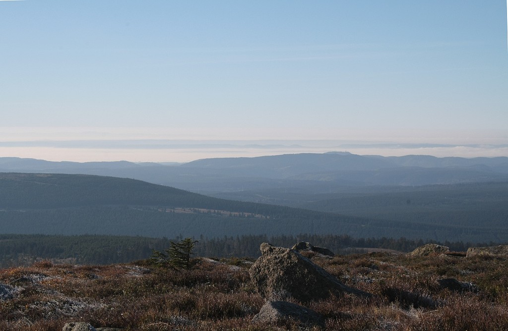 Blick am 15.10. nach Sonnenaufgang vom Gipfelrundweg des Brocken nach Süden über die Westflanke des Wurmbergs, den Südharz bis zur Hainleite, den Bleicheroder Bergen und dem Dün in Thüringen, die aus einem Nebelmeer herausragen. Dahinter ist zart der nordwestliche Teil des Thüringer Waldes mit dem "Großen Inselsberg" zu sehen (links im Nebelmeer unter dem Horizont) und man ahnt Vorberge der Rhön (rechts im Nebelmeer unter dem Horizont)! Die Heidelandschaft des Brocken ist von Raureif bedeckt.