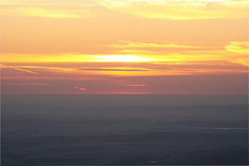 Auf dem Brocken vor Sonnenaufgang: die Sonne zeigt sich als zartes Glühen am Horizont; Blick am frühen Morgen des 28.08.2012 von der Treppe des Brockenhauses über das nordöstliche Harzvorland