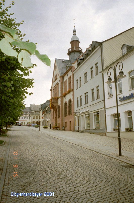 Blick auf Adorf/Vogtland. Von hier geht eine Bahnstrecke nach Bad Brambach und weiter nach Cheb (Eger). Ein weiteres Adorf gibt es im Erzgebirge bei Chemnitz. Aufnahme von 2001