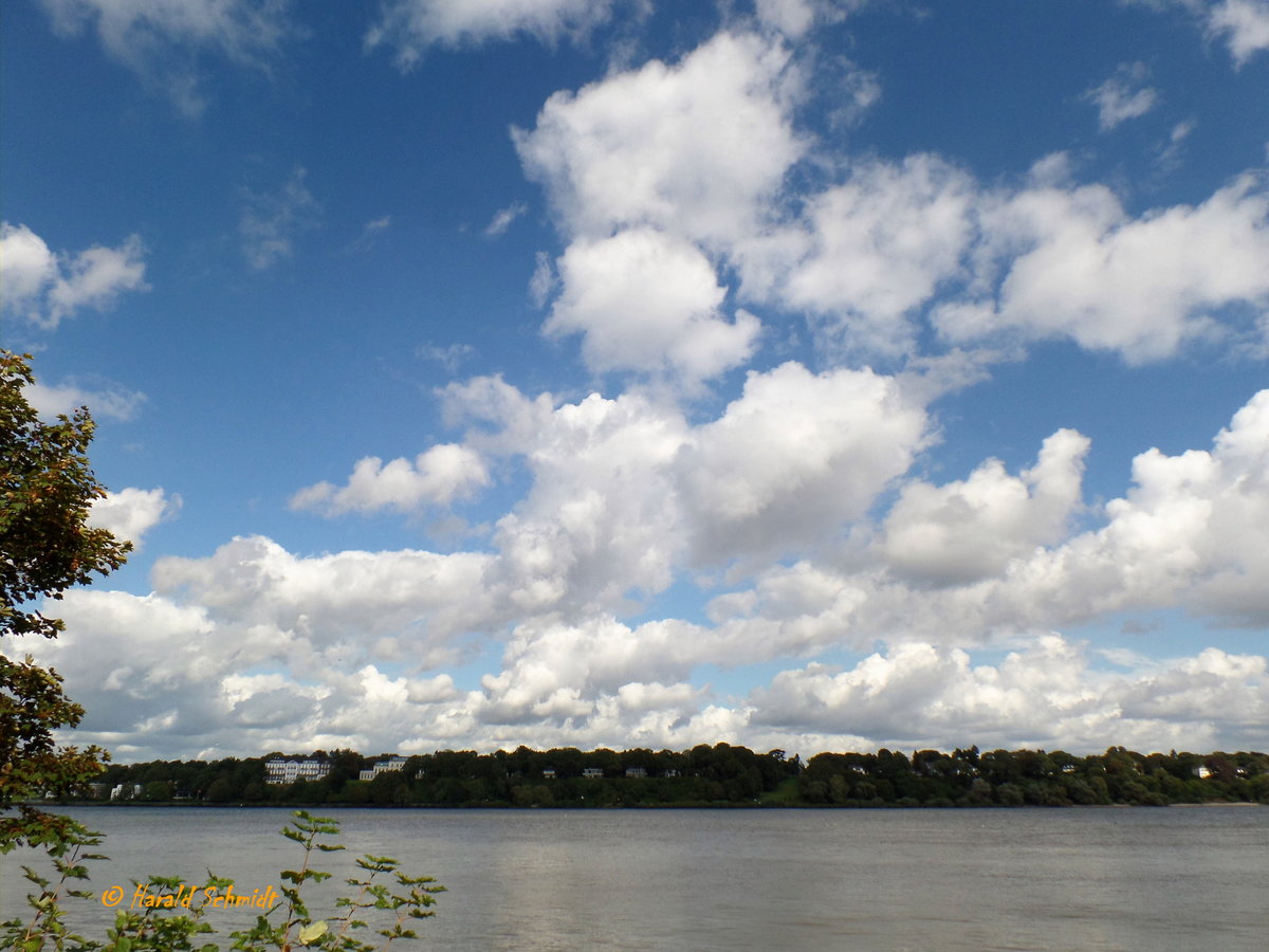 Hamburg am 15.9.2017: herbstliches Wolkenspiel über dem Stadtteil Othmarschen vom Südufer der Elbe gesehen /
