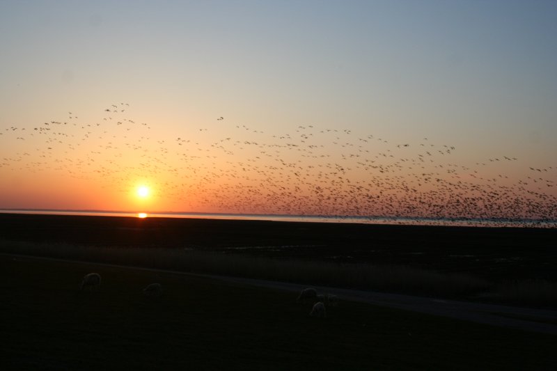 Durch ein paar wenige Gänse wird dieser schöne Sonnenuntergang getrübt. Hindenburgdamm am 23.4.2008.
