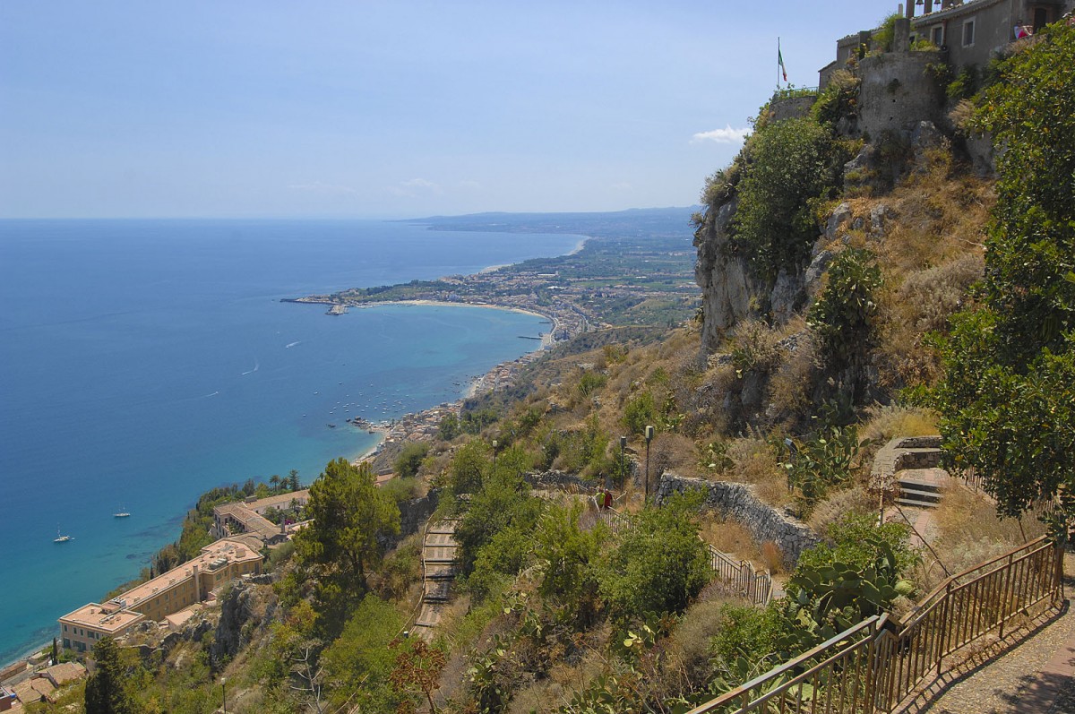 Aussicht Richtung Naxos von Taormina aus gesehen. Aufnahmedatum: 6. Juli 2013.