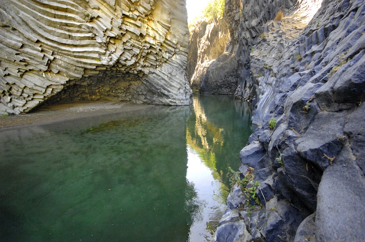 Die Gole dell’Alcantara sind Schluchten am Fluss Alcantara auf Sizilien. Die Wände besteht aus basaltischer Lava, die siliziumarm und reich an Eisen, Magnesium und Kalzium ist. Ein langsam erkaltender Lavastrom ermöglichte die Entstehung der prismischen, fünf- und sechseckigen Säulen. Aufnahme. Juli 2013.
