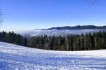 Blick vom 1241m hohen Kandel im mittleren Schwarzwald Richtung Norden auf die nebelgefüllte Rheinebene, die höchste Erhebung am Hoizont ist die 1164m hohe Hornisgrinde, der höchste Berg im Nordschwarzwald, Jan.2025