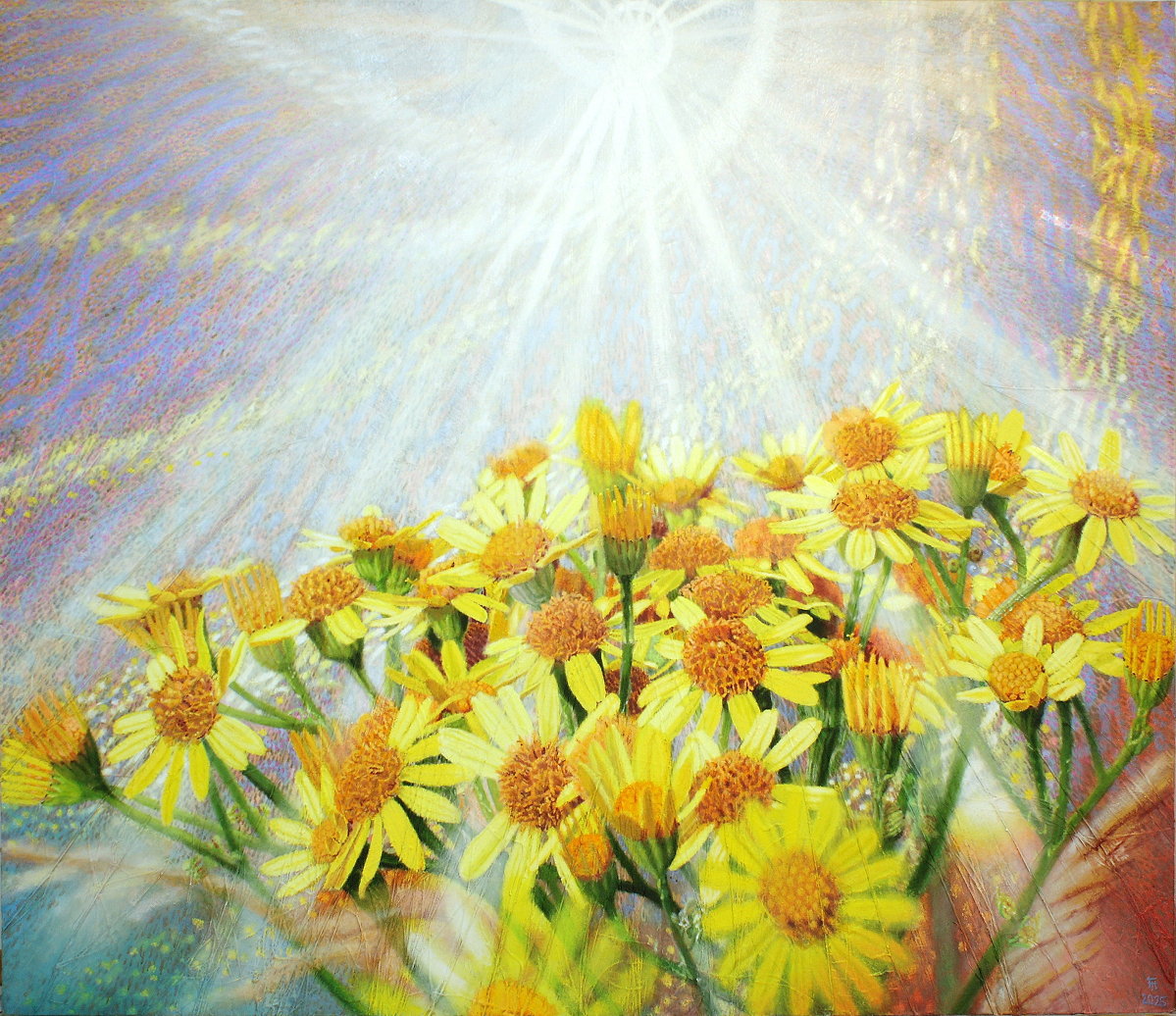 "Schneewaldglitzern"; Öl, Buntstifte auf Baumwolle, 2007 - 2009, 90 x 120 cm; Blick vom unteren Hang des Brockenmassivs bei Schierke über den Südostharz; Nach einer Aufnahme Anfang Januar 2009 gemalt...