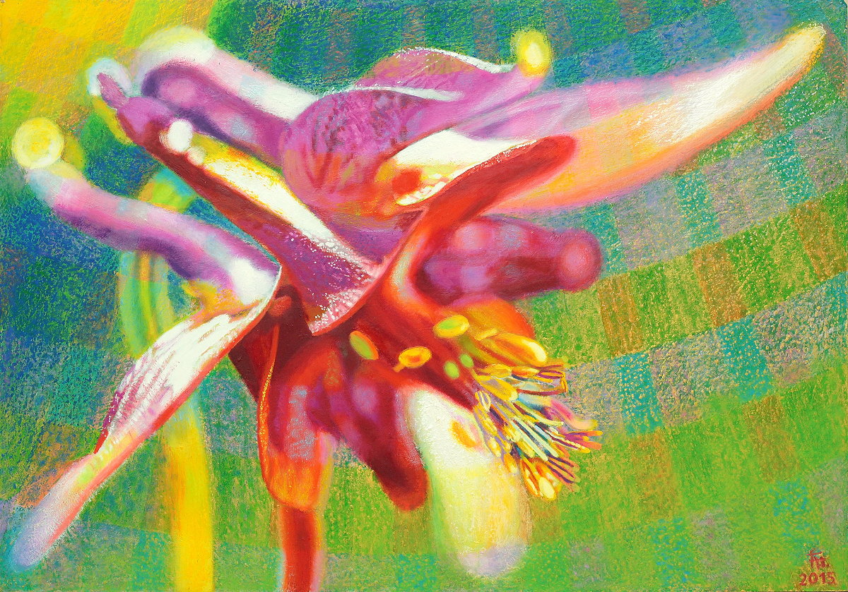 "Lichtblume 2 (Violette Akelei)", Gemälde: Öl, Gold- und Silberpastell auf Holz, 2015, 70 x 100 cm