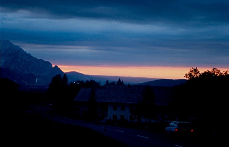landschaftliche Weite im abendlichen Österreich. Im Tal liegt Hallein, links darüber Bad Dürrnberg. Genau hinter dem Baum ist Salzburg. Sommer 2000