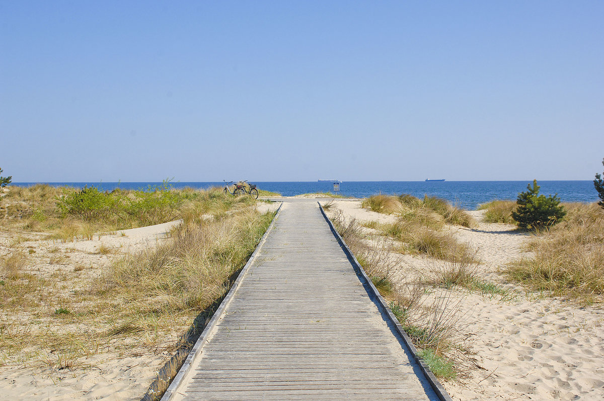 Die deutsch-polnische Grenze durch den Strandsand oberhalb der Dünen westlich von Świnoujście (Swinemünde). Aufnahme: 6. Mai 2016.
