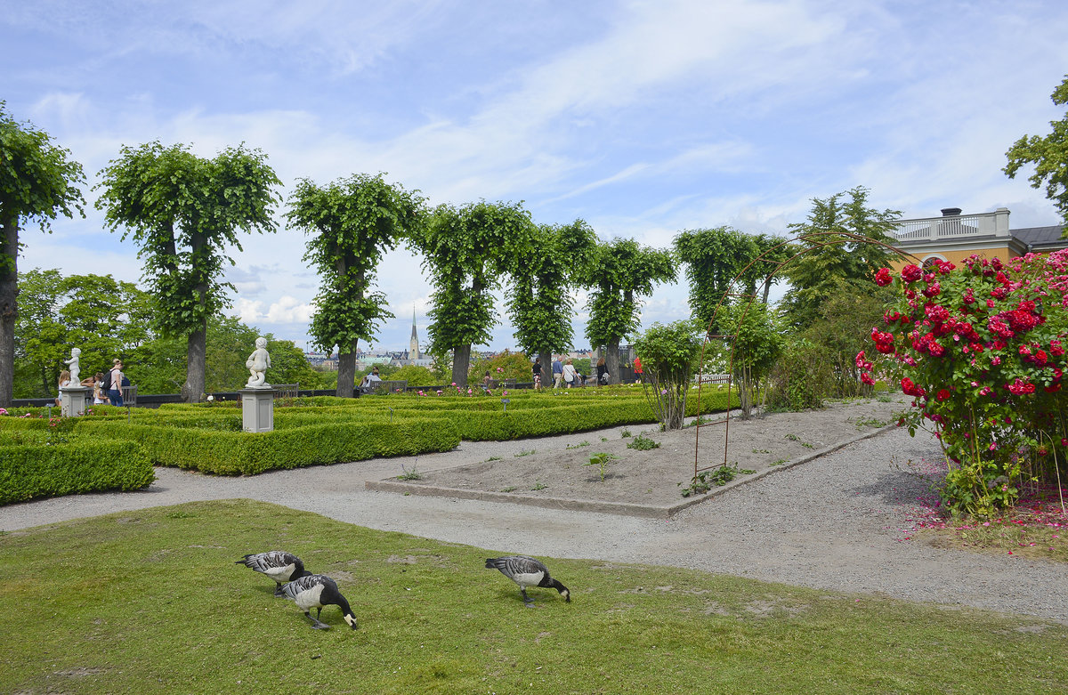 Park am Cafe Flickorna im Landschaftsmuseum Skansen in Stockholm. Aufnahme: 25. Juli 2017.