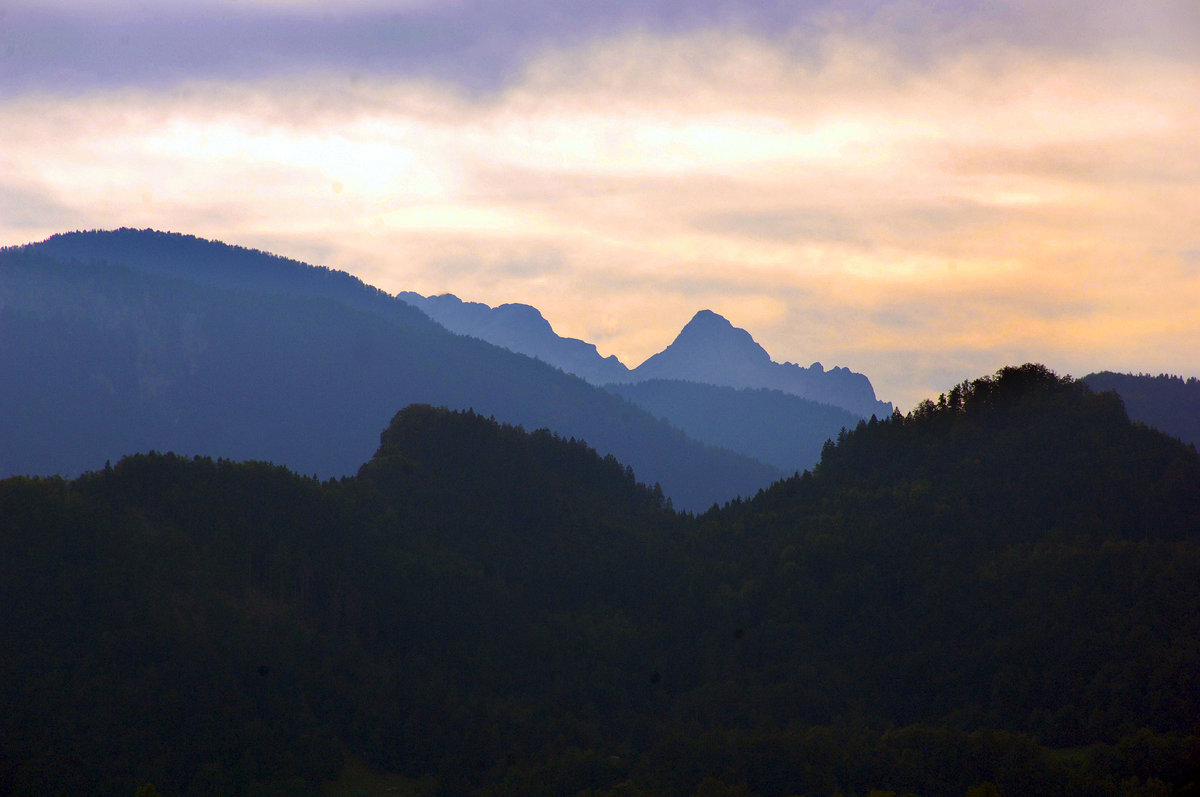 Dämmerung über die Julischen Alpen bei Bled. Aufnahme: 3. August 2016.