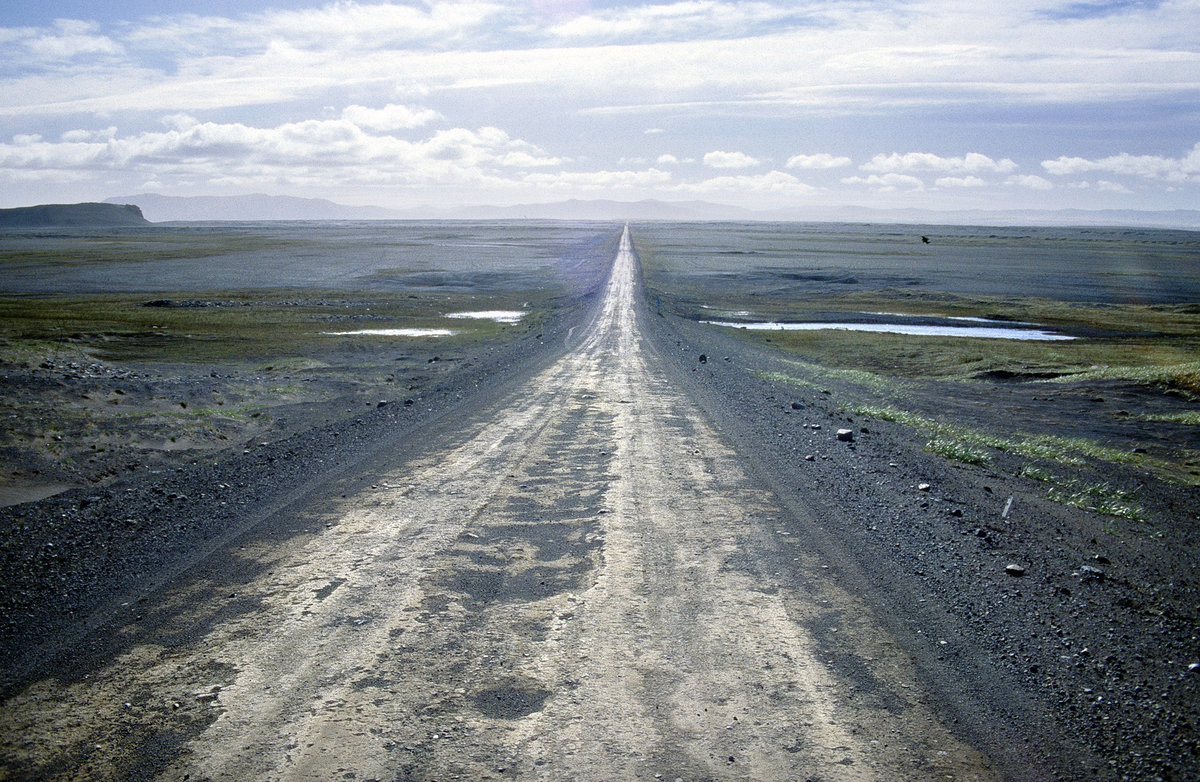 Straßenschild und Landschaft an der Ringstraße (Hauptstraße 1) in Nordirland Erstarr in Island. Aufnahme: August 1995 (Bild vom Dia). Hans Christian Davidsen