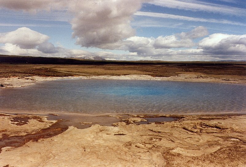 Große Geysir, nur 20 m vom Strokkur entfernt, im Juni 1997. Der Geysir entstand bei einen Erdbeben 1294 und war bis 1915 tätig, erneut nach einen Erdbeben von 1935 bis in die 50er Jahre und jetzt wieder von 2000 bis heute, er ist aber täglich nur ein paar Mal tätig mit einer Fontaine von ca. 10 Meter. 1997 war es nur ein kleiner See mit einer Wassertemparatur von 60 Grad. Nach diesen Geysir haben alle Geysire der Welt ihre Bezeichnung.