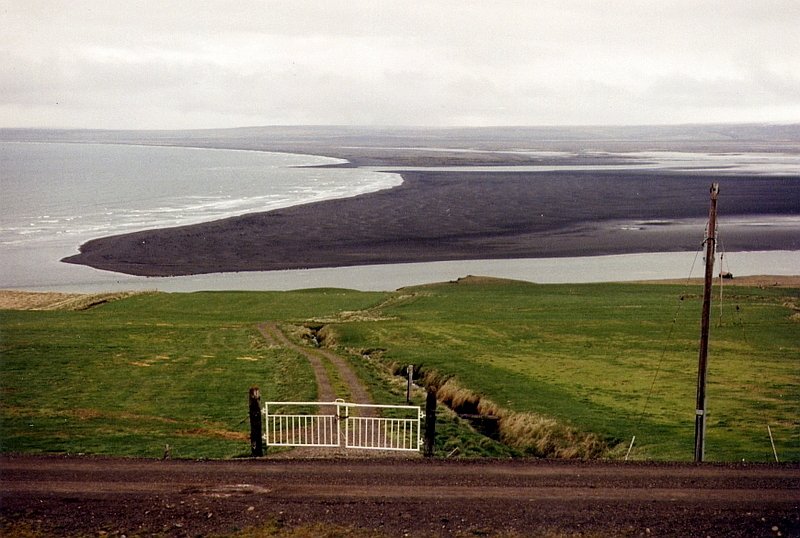 Küste neben der Jugendherberge Osar in Nord-Island im Juni 1997, auf der schwarzen Halbinsel waren viele Seelöwen, die schwarzen Punkte am Ufer sind welche, die meisten lagen aber faul am Ufer, ihre Lieblingsbeschäftigung, wie der Wirt sagte. Ich bin auf dem Weg hinab zum Ufer gegangen, dabei wurde ich von Vögel attakiert, die auf der Wiese brüteten, sie schlugen mir mit den Flügeln auf den Kopf. Außerdem wäre ich fast über eine brütende Graugans auf dem Weg gestolpert.