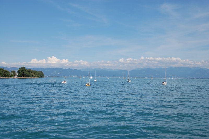 Auf der Rückfahrt von Mainau im Hintergrund Berge in Deutschland und Österreich, links eine der vielen Bodenseebuchten.