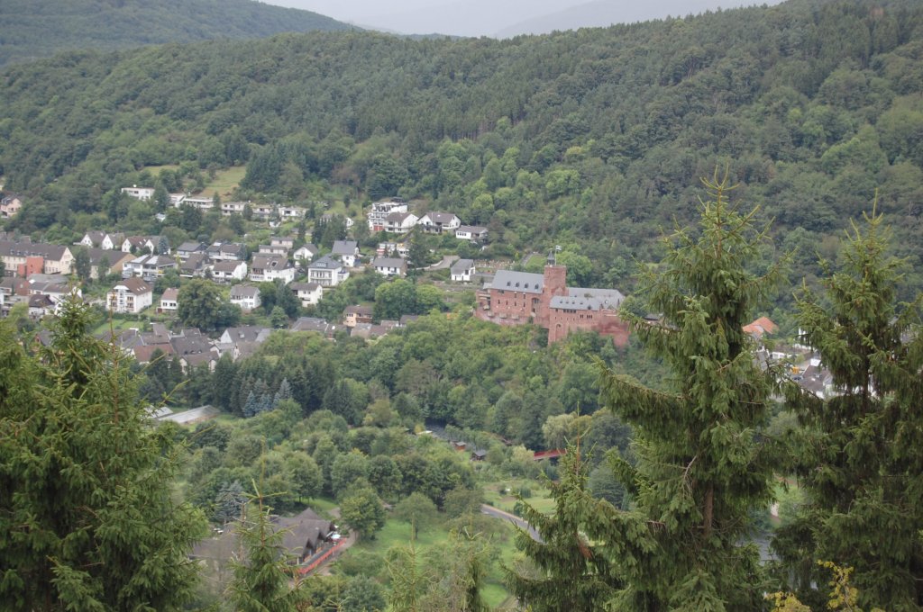 Blick auf Heimbach in der Eifel. Zwischen bewaldeten Hängen liegt die kleine Stadt im Rurtal( Rur ohne "h" fließt in Roermond/Nl in die Maas.