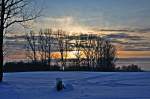 Hier ist die schön verschneite Feldlandschaft mit einem brachliegenden Landwirtschaftsunterstand bei Altenfelde am 27.01.10 zusehen. Oben geht schon langsam der Mond auf.