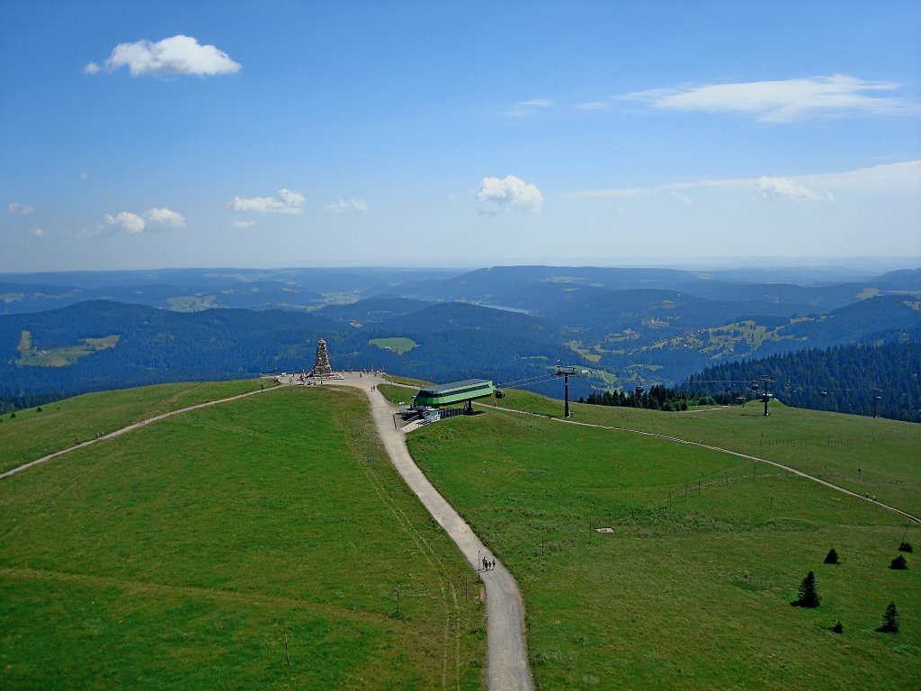 Blick vom Aussichtsturm auf dem Feldberg, höchster Berg des Schwarzwaldes mit 1493m, auf die Bergstation der Seilbahn und das Bismarckdenkmal, Juli 2010