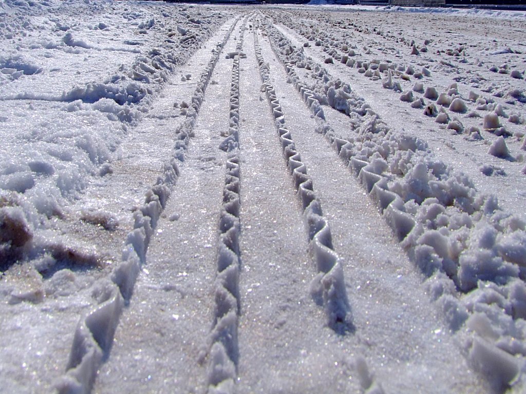 Profilspuren eines Autoreifens auf einer Schneefahrbahn bilden ein eigenwilliges Muster;120211