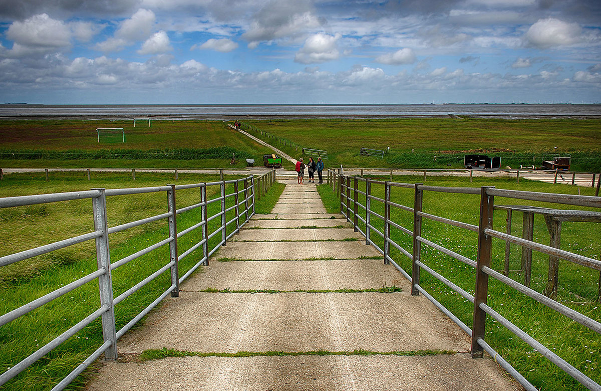 Auf dem Deich der Hallig Land im nordfriesischen Wattenmeer. Die Halligen erheben sich nur wenige Meter über dem Meeresspiegel, weshalb sie während einer starken Flut mit Ausnahme der Warften, künstlich aufgeschütteten Hügeln, auf denen die Häuser stehen, überspült werden (»Landunter«).