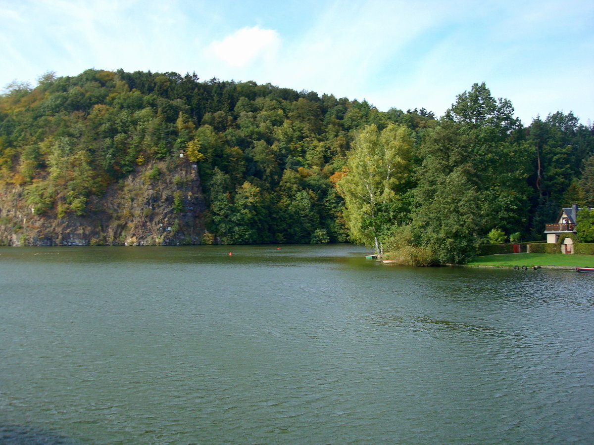Kriebsteintalsperre, Landschaft am ca.10Km langen, flußartigen Stausee, Okt.2009
